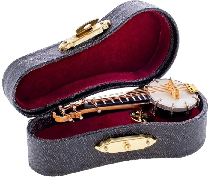 A finely detailed miniature banjo crafted into a stylish lapel pin, measuring 2.75″ L, perfect for music enthusiasts and collectors alike.
