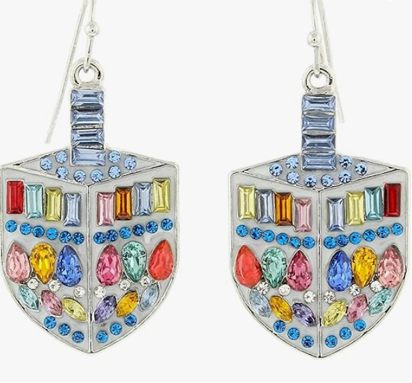 Featuring colorful gemstones and made to look like Jewish dreidels, these festive earrings add a colorful, Hanukkah-inspired touch to your jewelry collection.